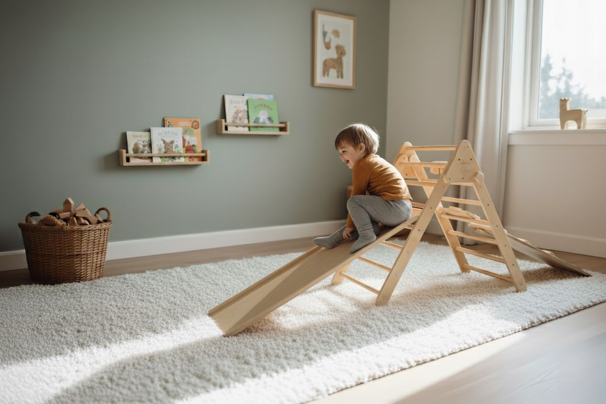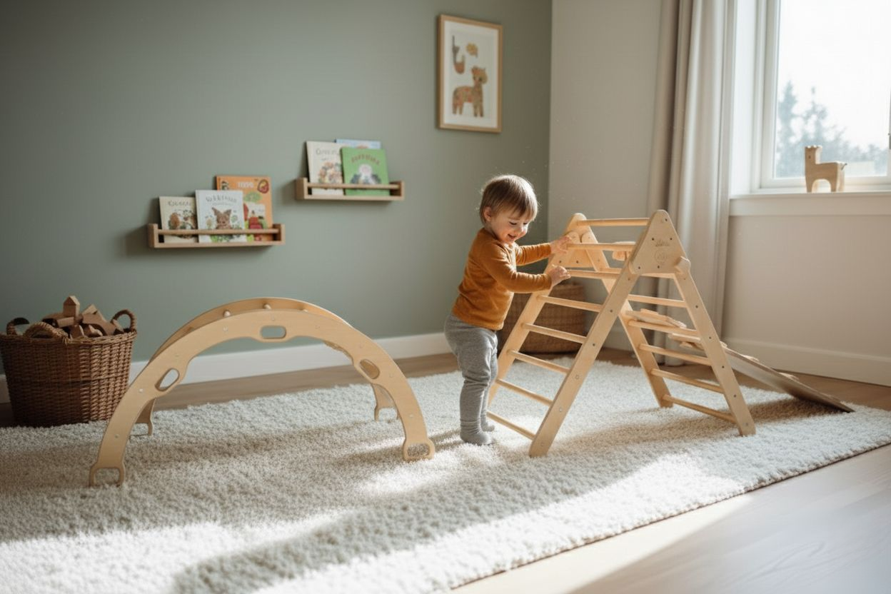 A premium 4-piece wooden climbing kit including a foldable triangle, arch/rocker, rock wall, and slide—perfect for indoor active play and motor skill development.