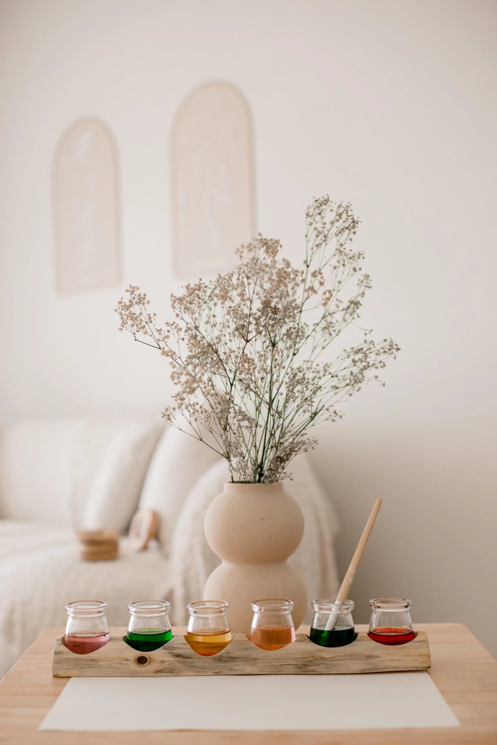 A beautifully crafted wooden paint stand designed for color mixing, painting, and creative exploration. Includes six glass jars securely held in place, inviting little artists to express themselves through art and discovery.