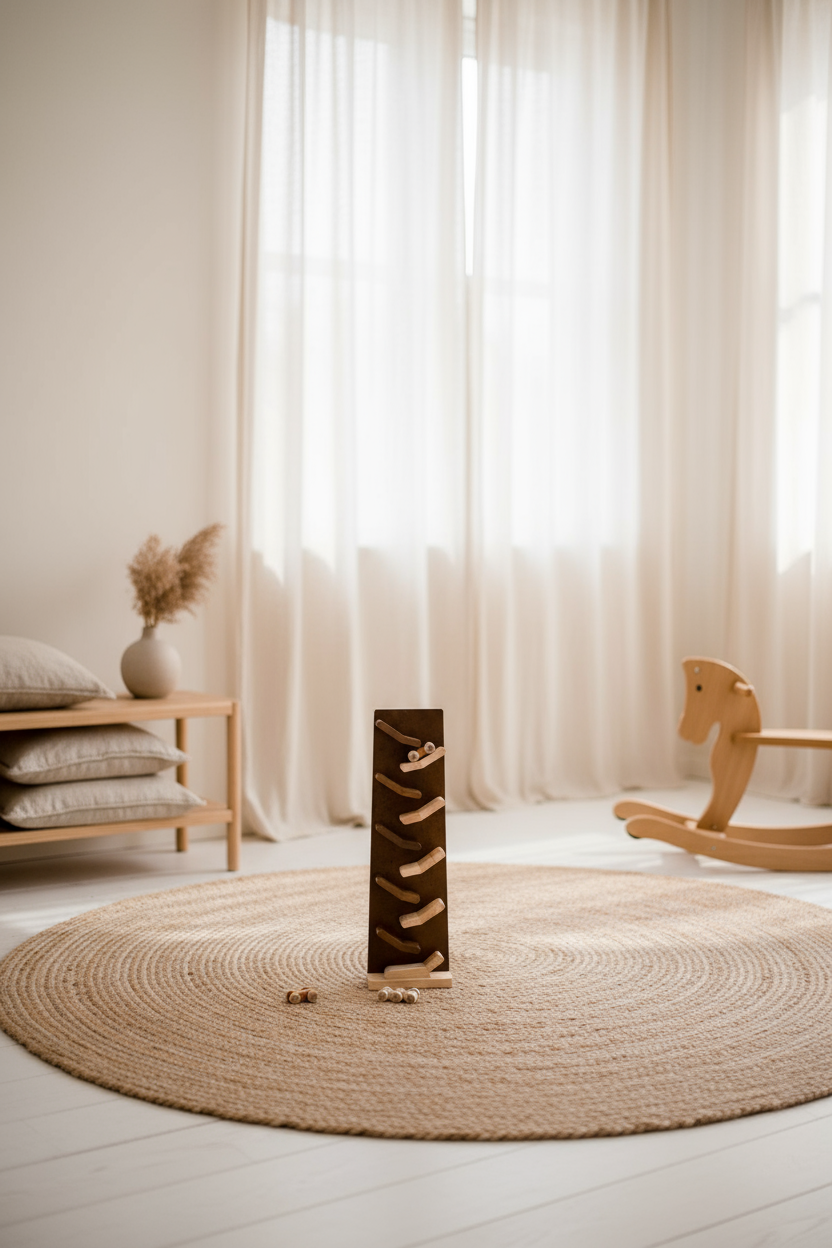 A vertical racing ramp where wooden cars zip down a zig-zag track, offering thrilling motion play that captivates and educates.