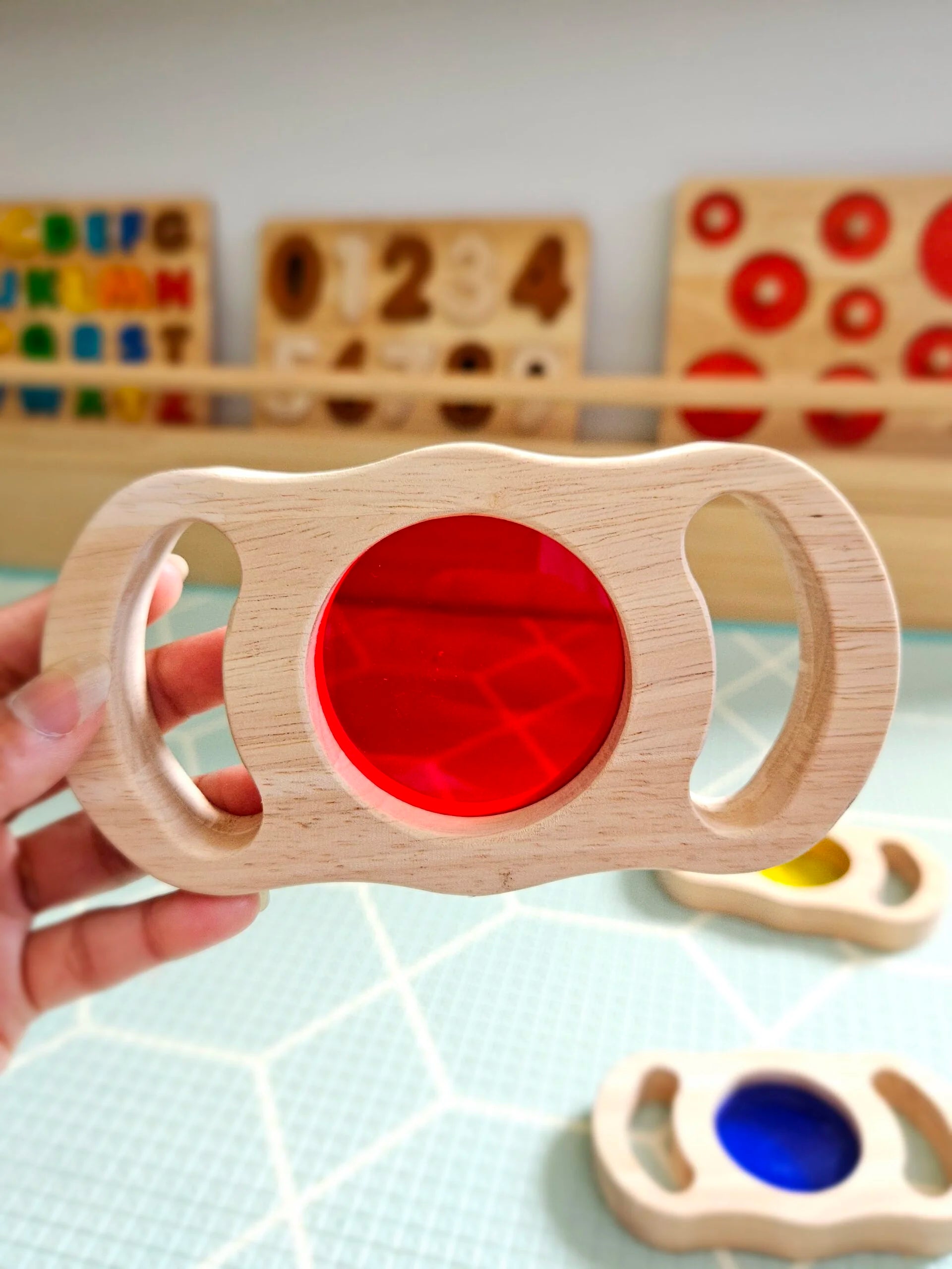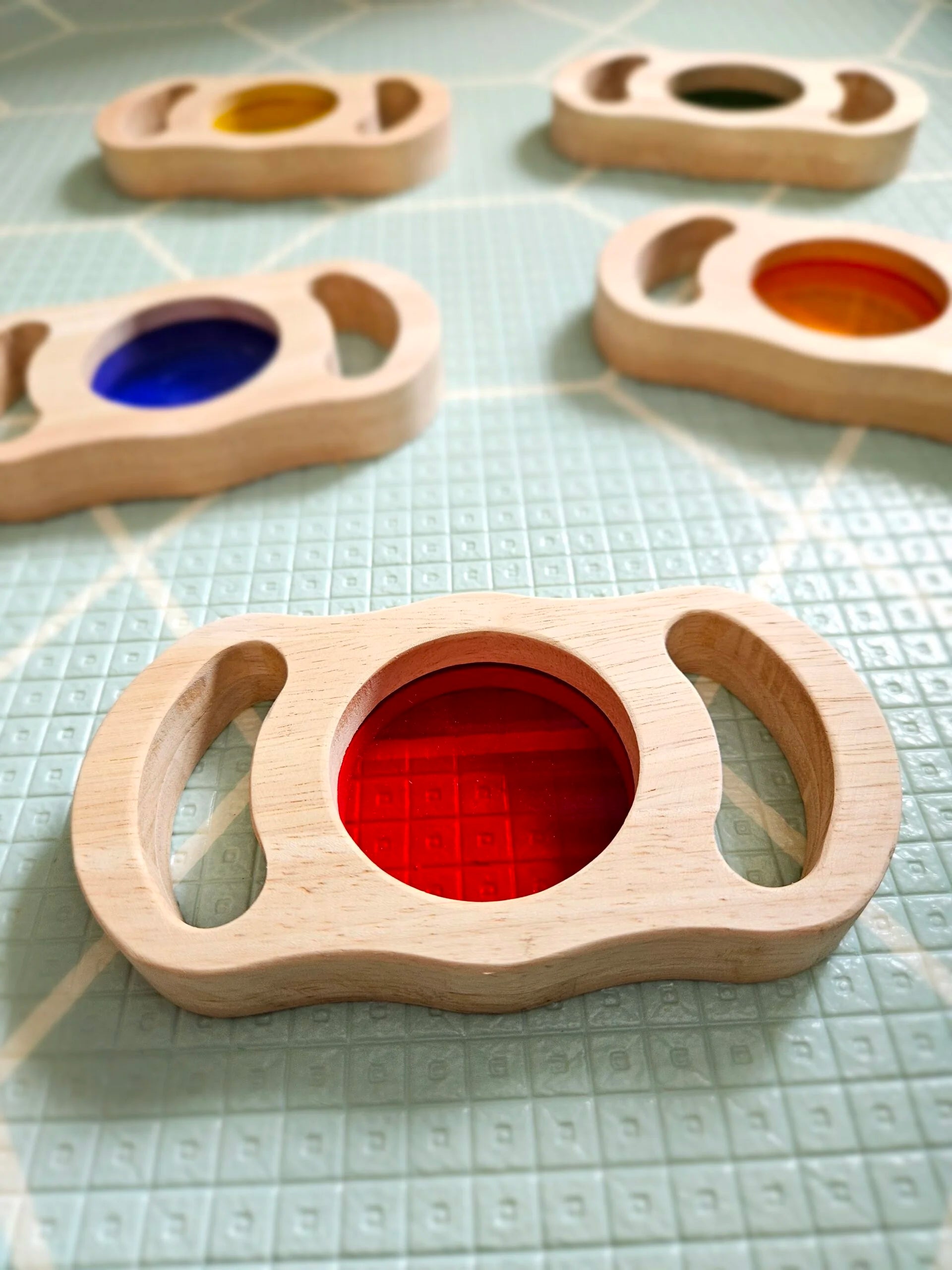 A captivating wooden set designed to explore light, color, and perception through play. Each smooth frame holds a translucent lens, inviting children to observe the world in vibrant hues and discover how colors blend and change.